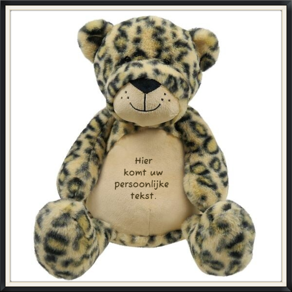 Deze leuke knuffel kan voorzien worden van een borduring op de buik, voor een extra persoonlijke touch.